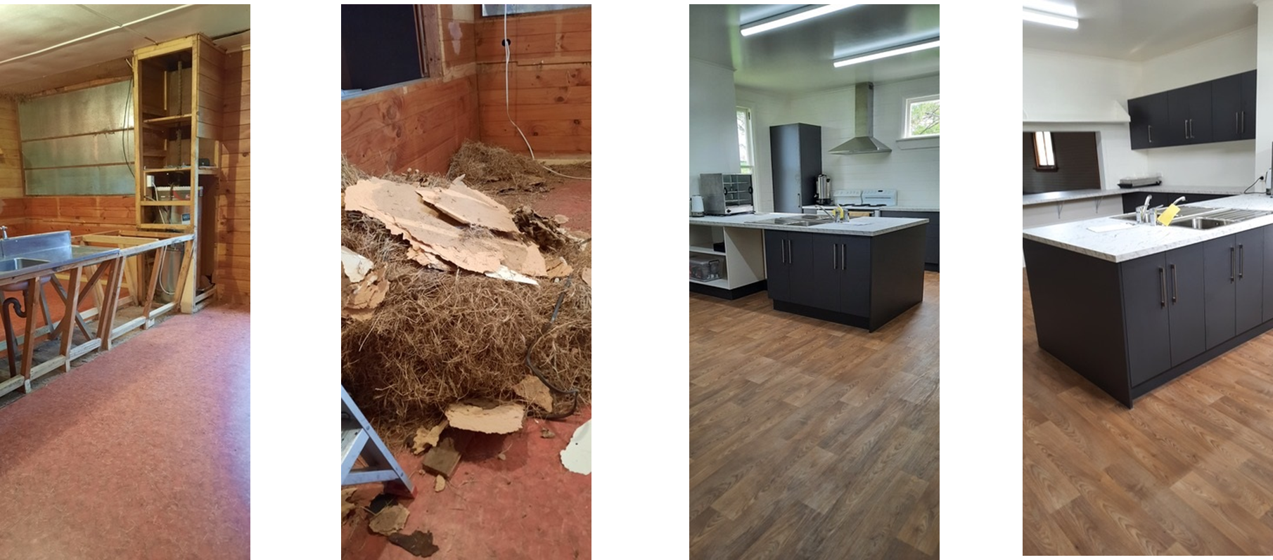 A before and after shot of Kiwitea Hall's kitchen renovation.